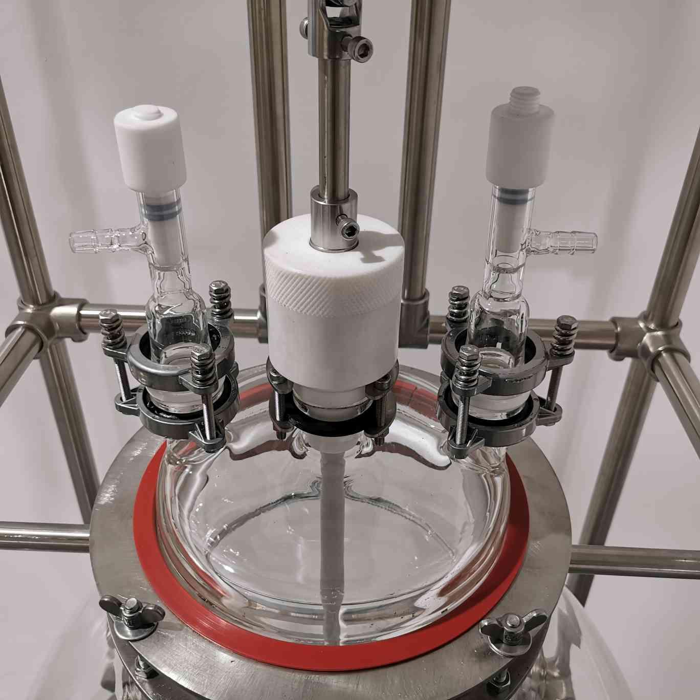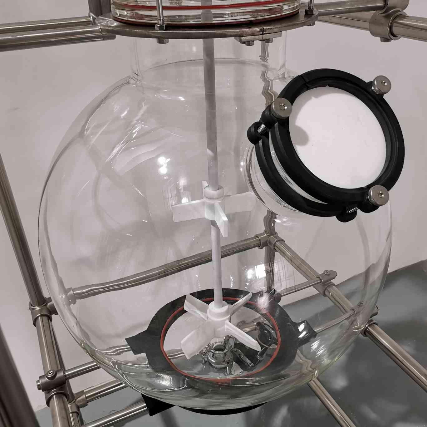 高硼硅球形玻璃釜體,加大固體投料口(直徑125mm),便于操作;清透潔亮,反應(yīng)全程清晰可見,便于實(shí)時掌控(容量可定制)。