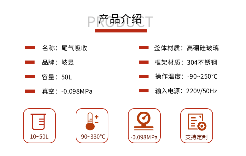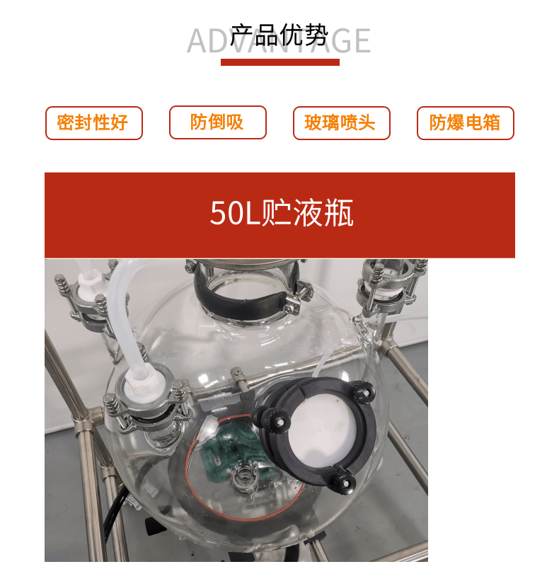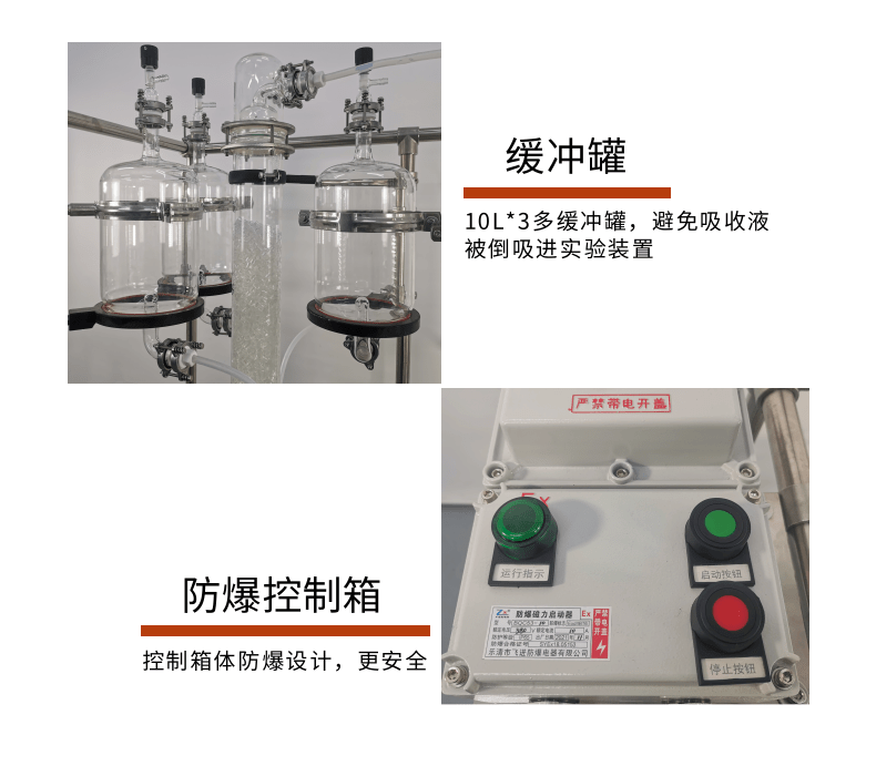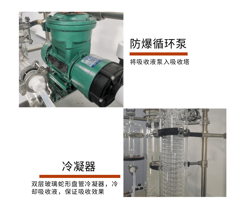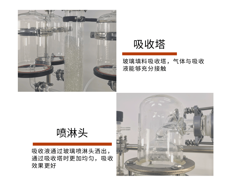 本款防爆尾氣吸收,配備三個防倒吸罐。磁力循環(huán)泵將吸收液從圓底燒瓶打入噴淋頭,從頂部落下。廢氣反方向進入吸收柱,兩者充分接觸后,快速達成凈化。